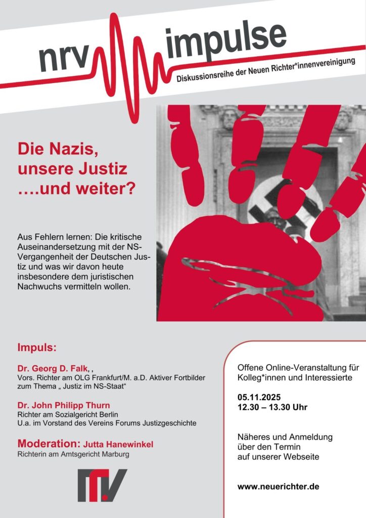 Die Veranstaltung findet im Rahmen unserer Veranstaltungsreihe „Impulse“ online statt und ist kostenlos. Sie ist offen für alle NRV-Mitglieder und Interessierte aus der Justiz. Wir bitten um Anmeldung beim NRV Bundesbüro (Mailadresse bb@neuerichter.de) unter Verwendung Ihrer dienstlichen Email-Adresse. Nach Anmeldung erhalten Sie von uns den Link zur Veranstaltung.