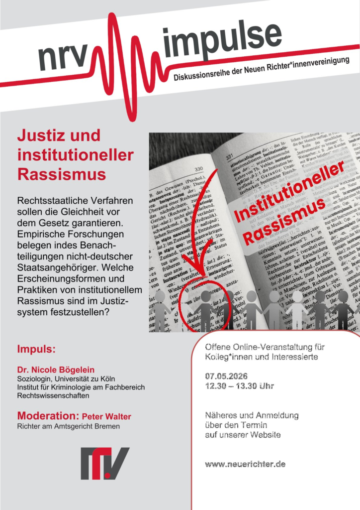 Die Veranstaltung findet im Rahmen unserer Veranstaltungsreihe „Impulse“ online statt und ist kostenlos. Sie ist offen für alle NRV-Mitglieder und Interessierte aus der Justiz. Wir bitten um Anmeldung beim NRV Bundesbüro (Mailadresse bb@neuerichter.de) unter Verwendung Ihrer dienstlichen Email-Adresse. Nach Anmeldung erhalten Sie von uns den Link zur Veranstaltung.
