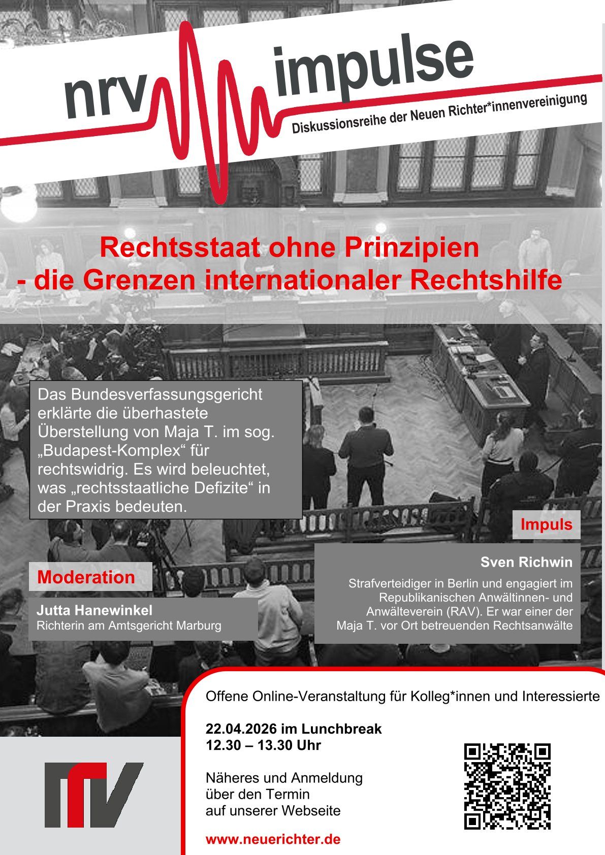 Die Veranstaltung findet im Rahmen unserer Veranstaltungsreihe „Impulse“ online statt und ist kostenlos. Sie ist offen für alle NRV-Mitglieder und Interessierte aus der Justiz. Wir bitten um Anmeldung beim NRV Bundesbüro (Mailadresse bb@neuerichter.de), möglichst unter Verwendung Ihrer dienstlichen Email-Adresse. Nach Anmeldung erhalten Sie von uns den Link zur Veranstaltung.